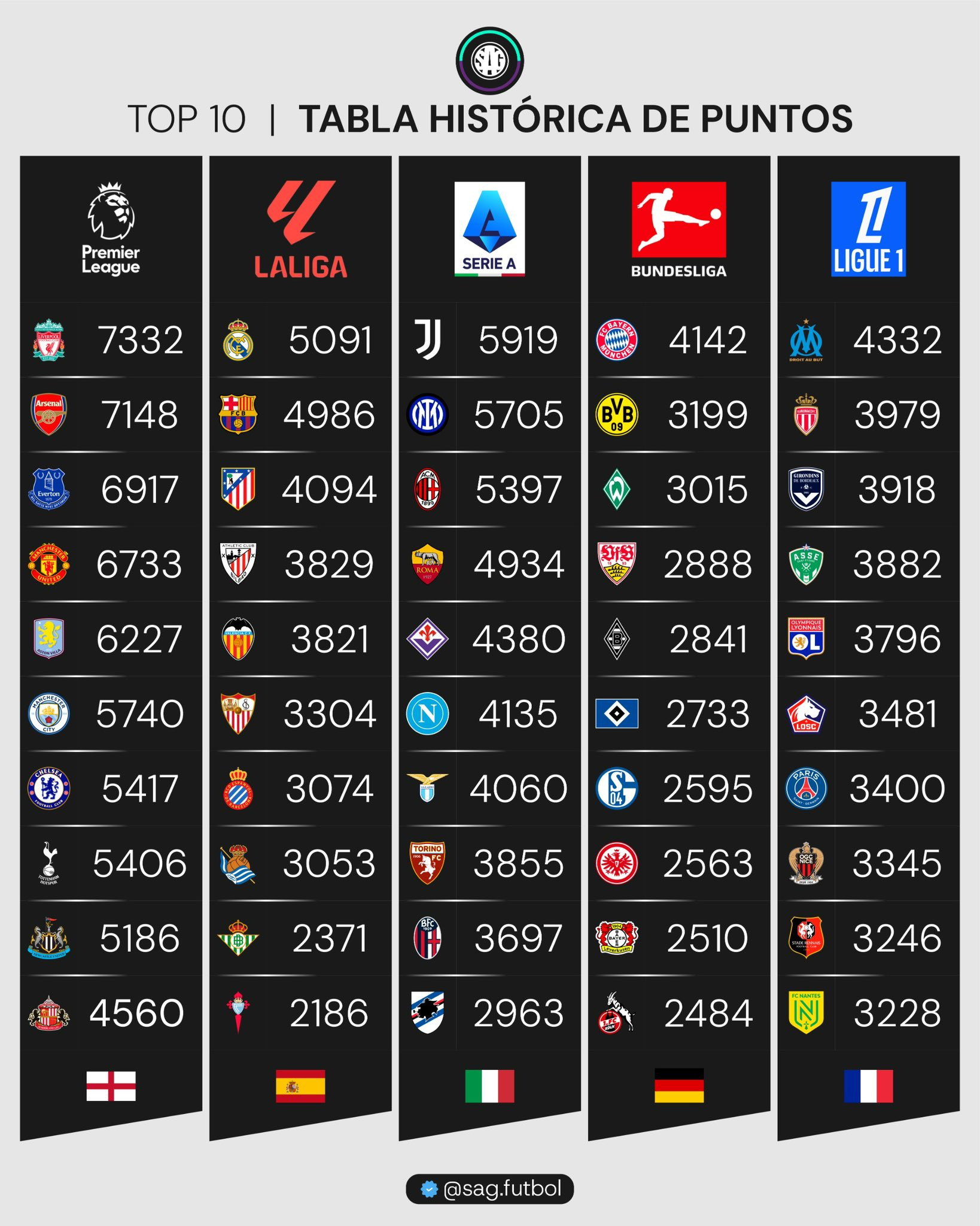 გთავაზობთ ევროპის ტოპ 5 ჩემპიონატის ისტორიულ ცხრილს