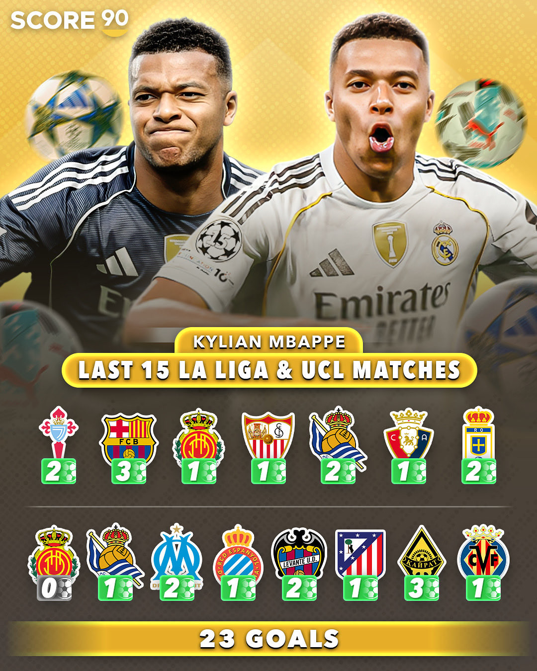 კილიან მბაპეს გოლების სტატისტიკა ლა ლიგის და ჩემპიონთა ლიგის ბოლო 15 მატჩში