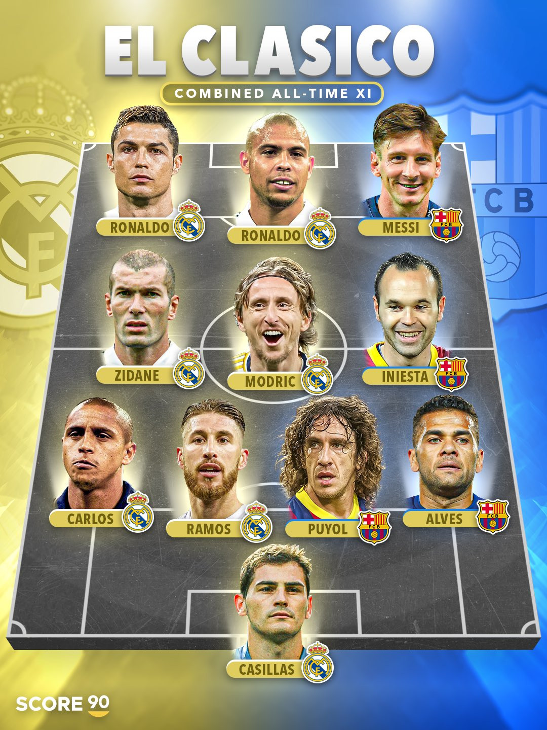Score 90-მა რეალის და ბარსელონას ყველა დროის საუკეთესო გაერთიანებული თერთმეტეული შეადგინა, სადაც ელ კლასიკოში მონაწილე გამორჩეული ფეხბურთელები მოხვდნენ.