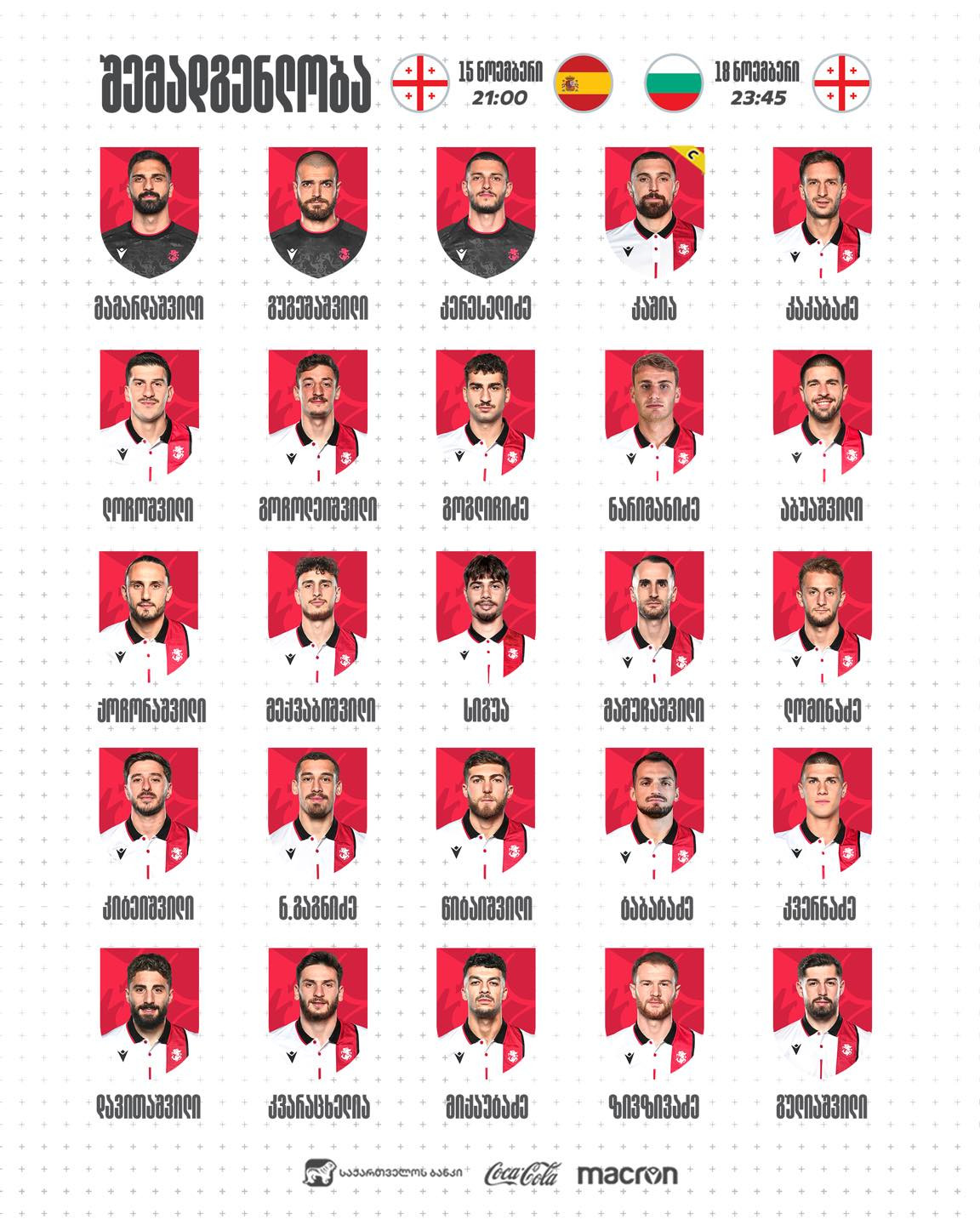 საქართველოს ეროვნული ნაკრების მთავარმა მწვრთნელმა, ვილი სანიოლმა ნოემბერის მატჩებისთვის 25 ფეხბურთელი გამოიძახა.